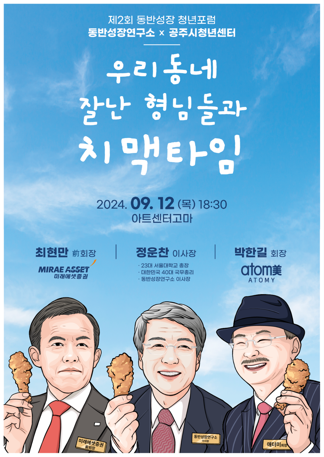 이날 행사에는 정운찬 동반성장연구소 이사장(전 국무총리), 박한길 애터미 회장, 최현만 전 미래에셋 회장이 멘토로 참여해 공주지역 젊은이들과 함께 창업 과정에서 겪는 어려움의 해결 방안에 대해 토론한다.