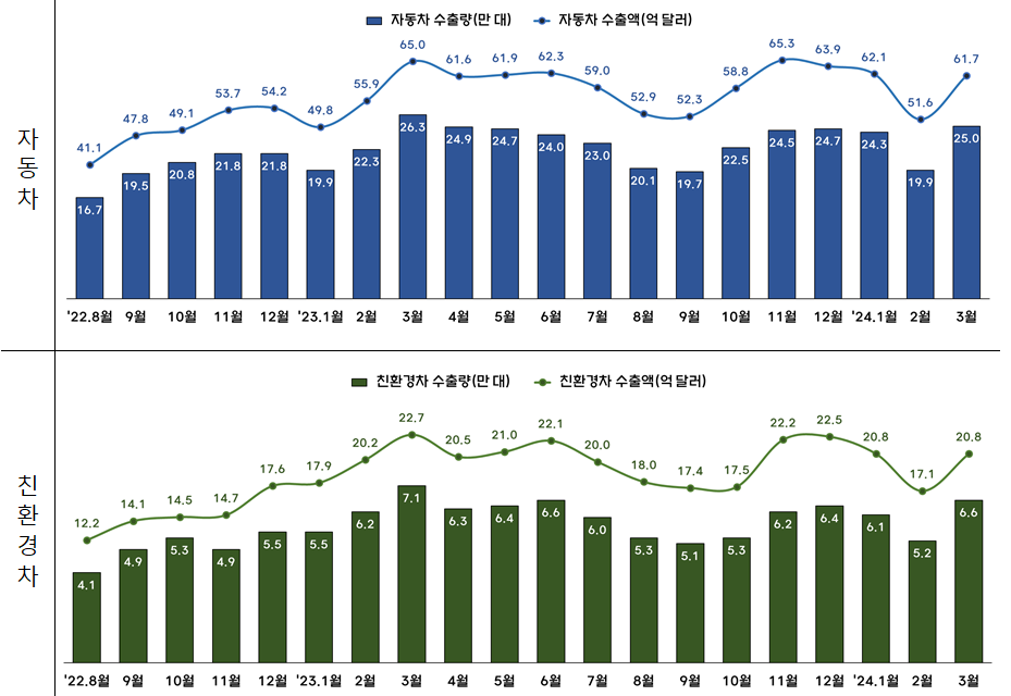 | 자동차 및 친환경차 수출량, 수출액 추이. [자료=산업통상자원부] |
