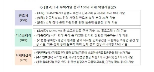 반도체는 소자, 설계, 공정 3개 분야에 45개, 디스플레이는 초실감, 차세대 프리폼, 융복합 기술 확보 등을 위해 28개, 차세대전지는 이차전지, 수소연료전지, 동위원소전지 분야에 27개 기술을 선정했다.