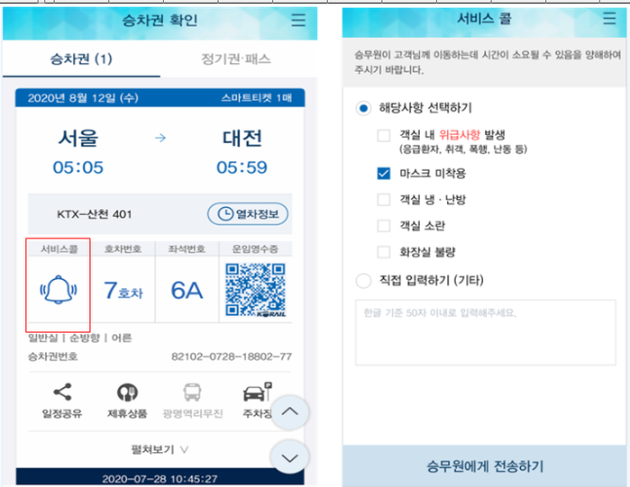 모바일 앱 ‘코레일톡’의 ‘승차권 확인’ 화면에서 ‘서비스콜’ 아이콘을 누르면 승무원에게 간편하게 도움을 요청할 수 있다. 응급환자나 취객, 폭행, 난동등 위급상황 발생 △마스크 미착용 △객실 냉난방 등 유형을 선택하거나 직접 내용을 입력할 수 있다.