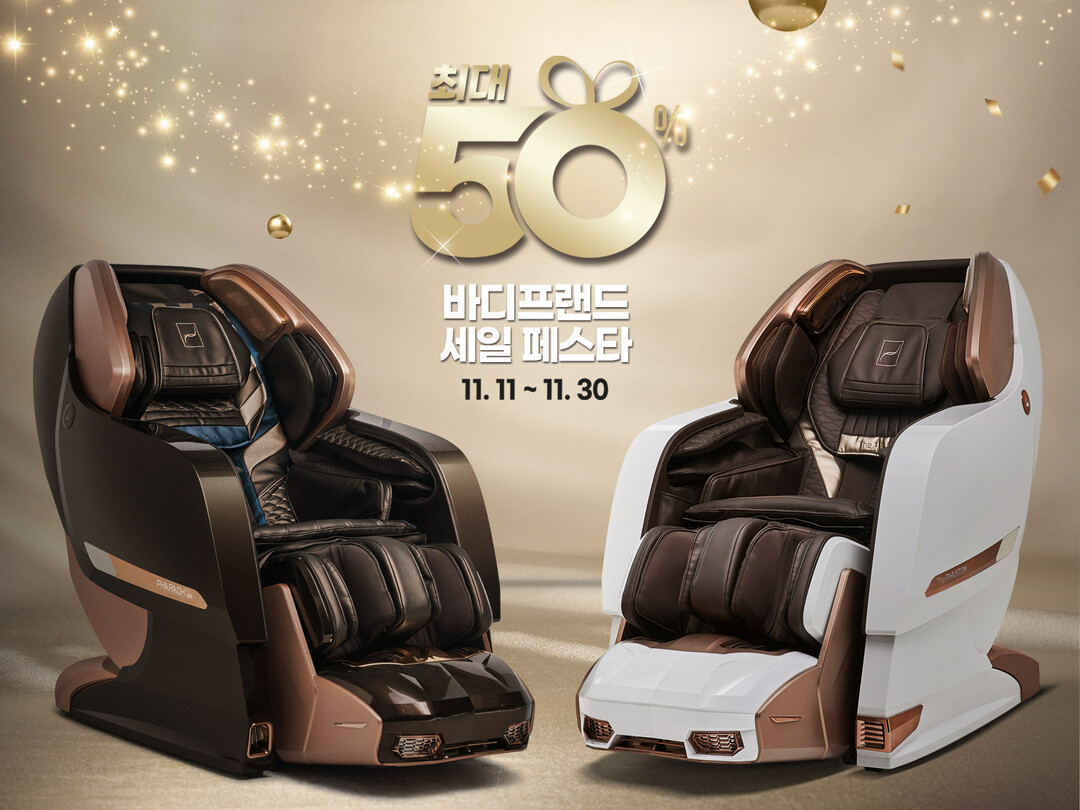 주요 할인 대상 품목은 ▲XD-FLEX(플렉스) 마사지 모듈로 부드러운 안마감을 제공하는 ‘파라오2 블랙 에디션’ ▲스테디셀러 ‘더팬텀’ △냉·온풍 시스템이 적용된 ‘파라오2 쿨’ ▲콤팩트 안마의자 ‘허그체어 3.0’ ▲온열 기능 특화 마사지 베드 ‘에이르’ 등 다양하다.