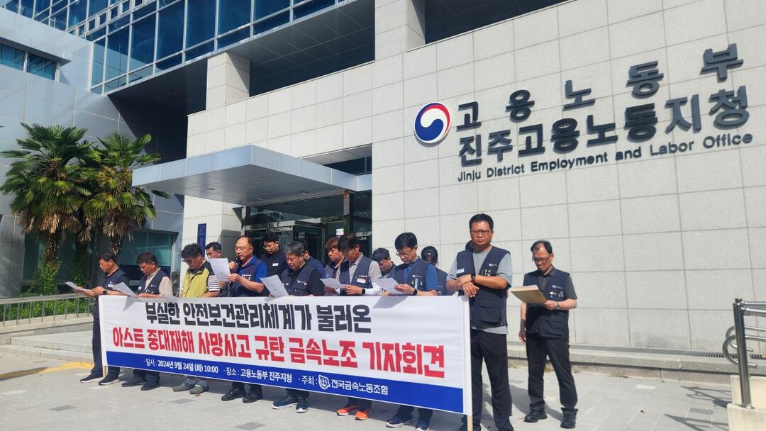 이에 금속노조 경남지부는 24일 고용노동부 진주지청 앞에서 가진 기자회견을 통해 “제대로 된 교육과 안전장치 없이 노동자를 작업에 투입해 사망사고가 발생했다”라고 주장했다.