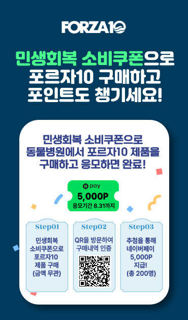 이번 이벤트는 소비쿠폰으로 포르자10 제품을 구매한 후, 동물병원 내 비치된 QR코드를 통해 구매 내역을 제출하면 자동으로 응모된다. 추첨을 통해 총 200명에게 네이버페이 5000포인트가 지급되며, 응모 기간은 8월 31일까지다.