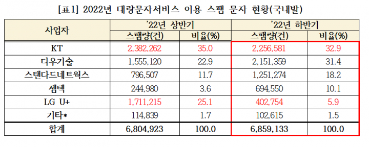 방송통신위원회가 지난달 31일 발표한 2022년 하반기 스팸 유통현황을 살펴보면, 같은 해 상반기 대비 LG유플러스는 큰 폭의 감소치를 보인 반면 KT는 여전히 스팸 문자 발송량이 압도적으로 1위를 차지했다.