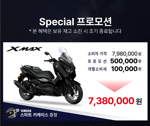 이번 스페셜 프로모션은 검증된 성능과 스타일을 갖춘 XMAX를 합리적인 가격에 만날 수 있는 기회로, 고객 최종 구매가가 기존 소비자 가격인 798만원 대비 대폭 낮아진 738만원(VAT 포함)으로 책정됐다.