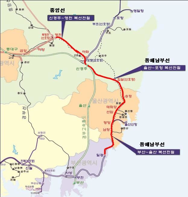 현재 동해남부선 부산~울산(일광~태화강) 구간은 비전철로 운행하고 있으나 이번 전원공급을 통해 전철화할 예정이며, 울산~포항 및 영천~신경주 구간은 현재 건설중인 구간으로 금년 말에 복선전철로 개통할 예정이다.