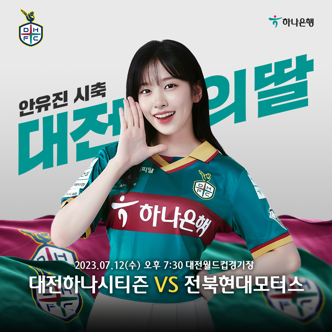 우선, 안유진은 경기 시작 전 시축자로 나서 대전의 승리를 기원하며, 홈팬들과 함께 그라운드에 뜨거운 열기를 불어넣어 대전하나시티즌 선수단에게 승리의 기운을 전할 예정이다.