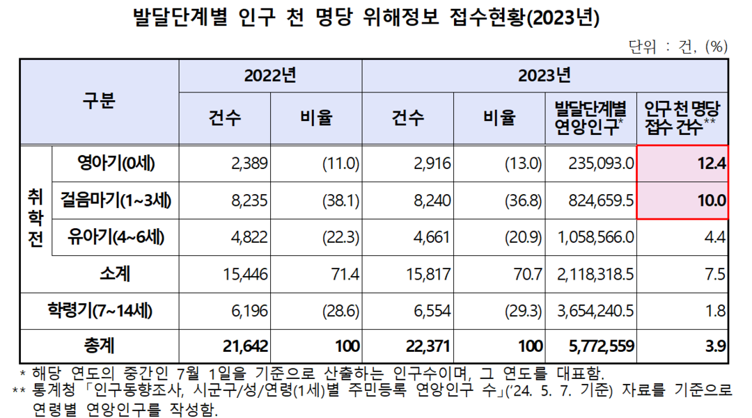 인구 1000명당 발달단계별 안전사고 건수는 영아기(0세) 12.4건, 걸음마기(1~3세) 10건, 유아기(4~6세) 4.4건, 학령기(7~14세) 1.8건 순으로 나타났다.