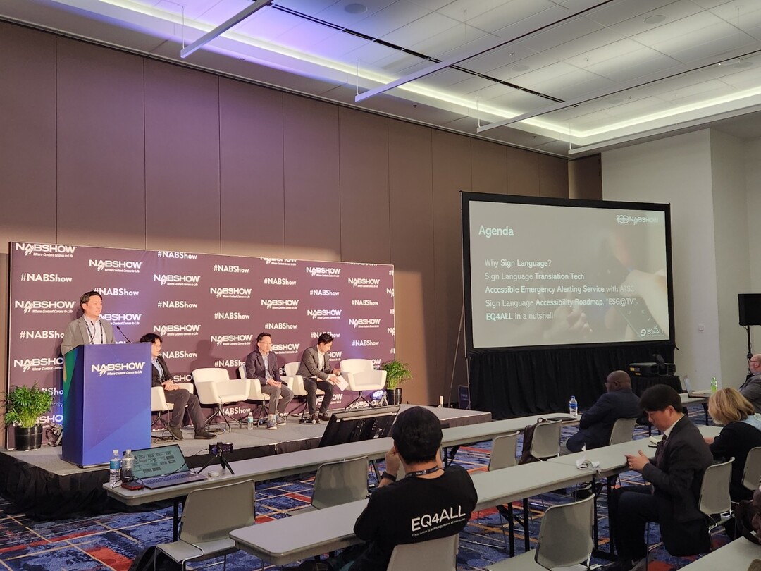 | NAB 2023행사에서 ATSC 3.0 기반 재난 정보 아바타 수어 서비스에 대해 발표하는 모습. [사진=이큐포올] |