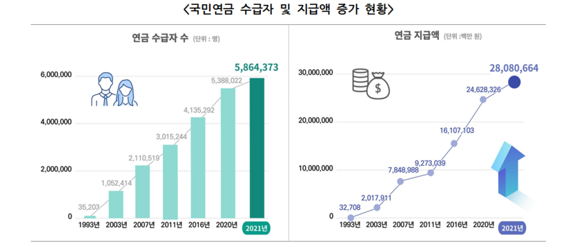| ▲ 국민연금 수급자 및 지급액 증가 현황. [사진=국민연금공단] |