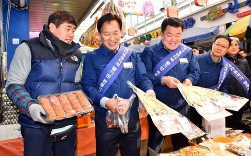 노사 대표들은 이날 온누리상품권으로 과일과 건어물, 수산물 등을 구입하고 상인들과 명절 덕담을 나눴다.