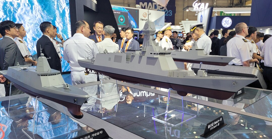 | 지난해 부산 해운대구 벡스코에서 열린 ‘2023 부산국제조선해양대제전’에서 한화오션이 울산급 Batch-Ⅲ 호위함과 한국형 구축함(KDDX), 한국형 차세대 스마트 구축함(KDDX-S), 합동화력함 등 수상함 모형을 선보이고 있다. [사진=연합뉴스] |