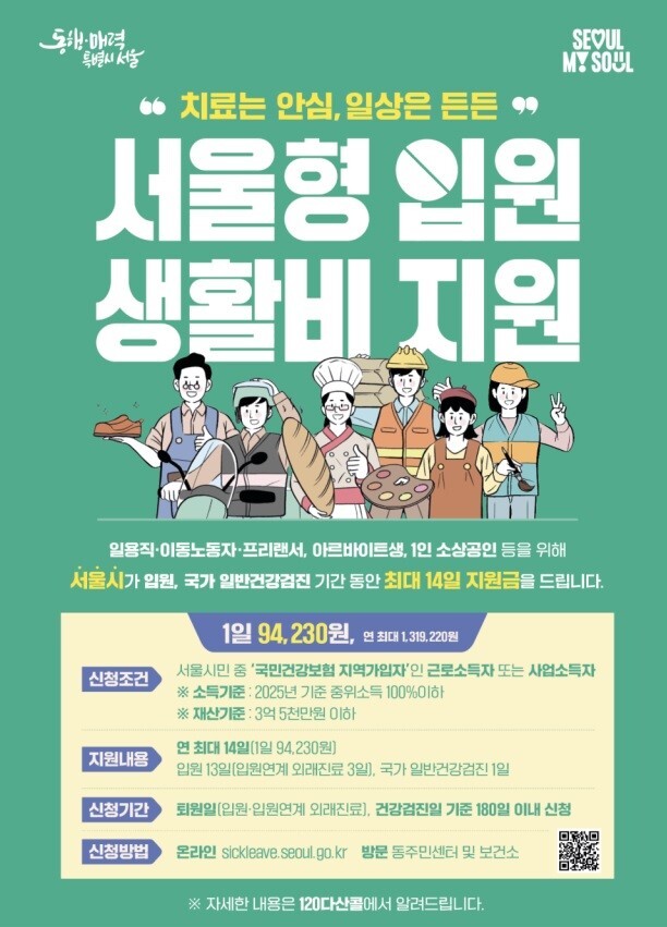 [하비엔뉴스 = 박정수 기자] 서울시는 노동 취약계층이 치료나 건강검진으로 발생하는 소득 공백을 보장받을 수 있는 ‘서울형 입원생활비’ 지원을 확대 운영한다고 17일 밝혔다.