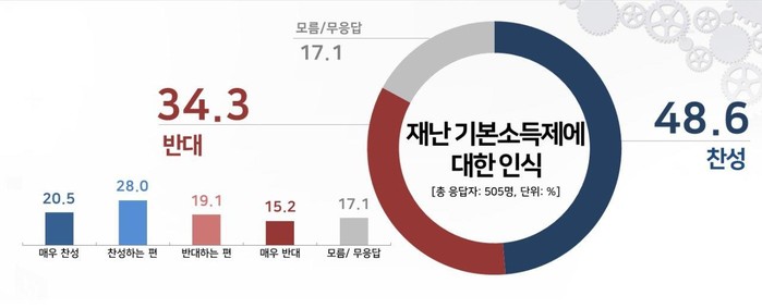 16일 리얼미터 발표에 따르면 YTN 의뢰로 지난 13일 전국 18세 이상 505명을 대상으로 조사(95% 신뢰수준에 표본오차 ±4.4%포인트)한 결과 재난 기본소득제 도입에 찬성한다는 응답은 48.6%로 집계됐다. 반대한다는 응답은 34.3%로 나타났다. 모름·무응답은 17.1%였다.