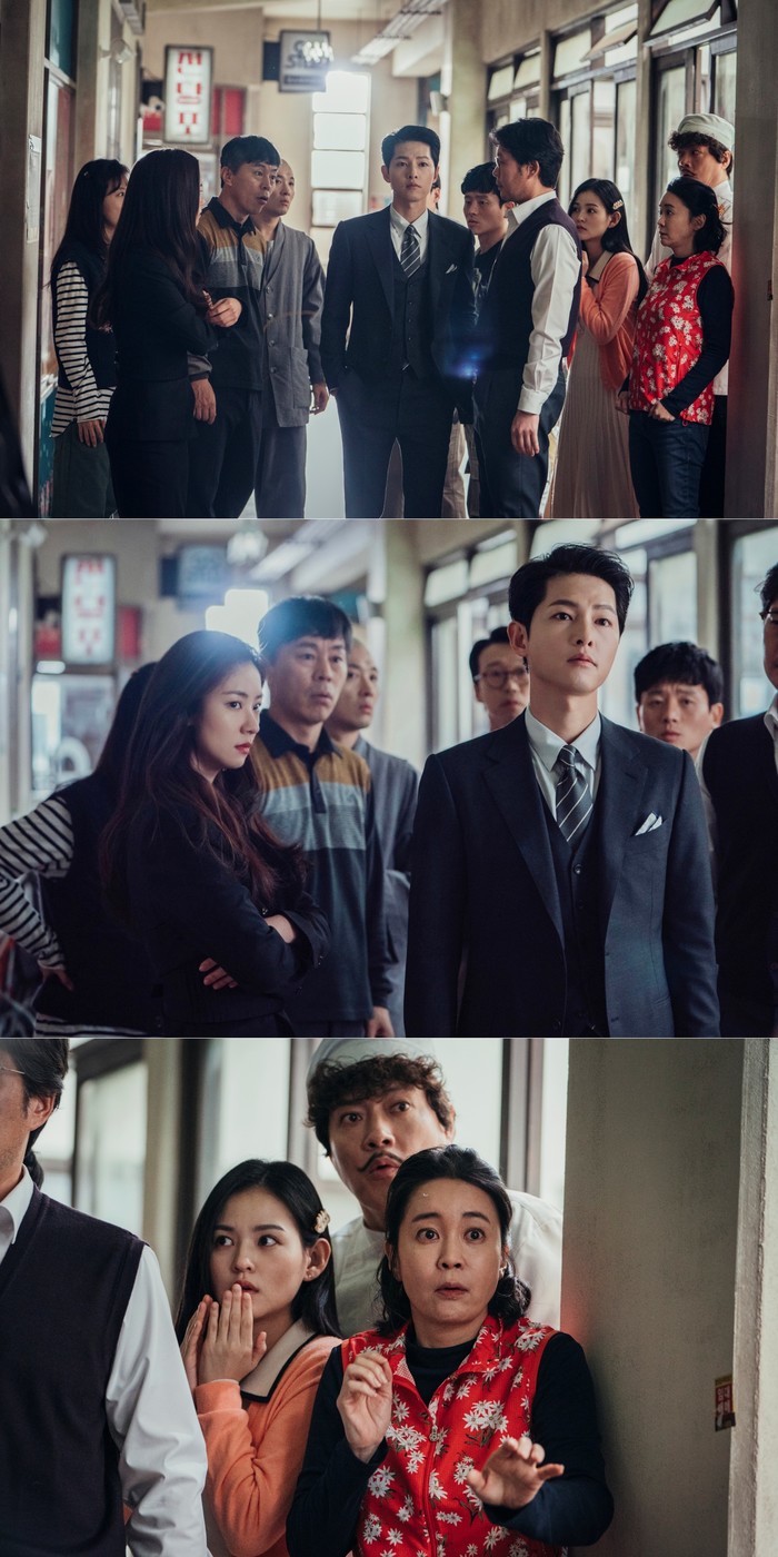 첫 방송을 앞두고 공개된 사진 속 금가프라자에 홀연히 나타난 이탈리아 마피아 변호사 빈센조의 모습이 호기심을 자극한다. 무슨 일인지 다급하게 한자리에 모인 금가프라자 세입자들. 그 사이 홍해를 가르듯 등장한 빈센조의 아우라가 심상치 않다. 좀처럼 보기 힘든 우월한 비주얼에 저절로 눈길이 꽂히는 가운데, 서늘한 카리스마가 분위기를 장악한다. 낯선 이방인의 등장에 눈을 떼지 못하고 주시하는 금가프라자 사람들의 호기심 어린 얼굴도 흥미롭다.