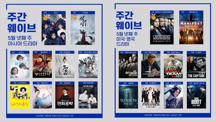주간웨이브 미국·영국 드라마 차트에는 오랫동안 상위권을 유지하던 ‘그레이 아나토미’를 밀어내고 웨이브 최초공개 작품인 ‘매니페스트’가 2위를 차지하며 순위 변동을 일으켰다.