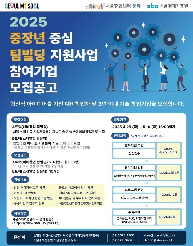 김정범 서울시 창업정책과장은 “중장년층은 현장 경험과 전문성을 갖춘 창업 자원으로서 매우 중요하다”며 “이번 사업을 통해 중장년층의 창업을 촉진하고 창업 리스크를 줄여 실질적인 성과를 낼 수 있도록 지원을 아끼지 않겠다”라고 말했다.