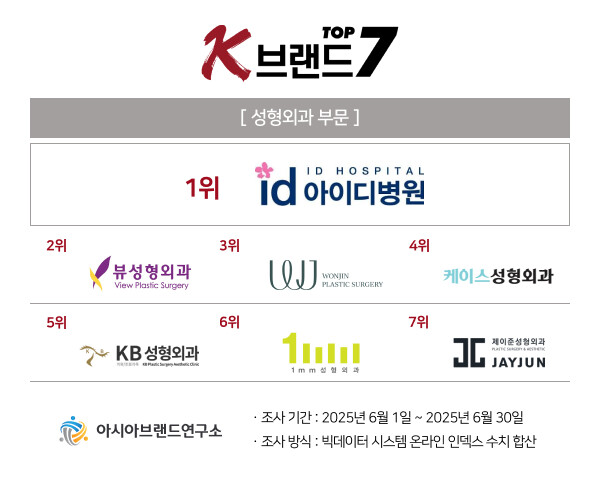 이번 ‘K-브랜드 톱7’ 성형외과 부문은 아이디병원이 1위를 수성한 가운데, 2위 뷰성형외과의원, 3위 원진성형외과의원, 4위 케이스성형외과, 5위 KB성형외과, 6위 일미리성형외과의원, 7위 제이준성형외과의원 등이 영예를 차지했다.