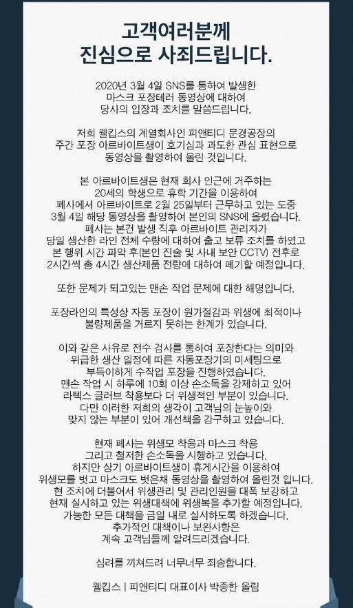 '착한 마스크'로 주목받은 마스크 제조업체 웰킵스가 한 아르바이트생의 비위생적인 행동에 대해 공식 사과했다.