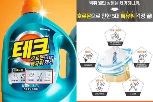 해당 문구는 LG생활건강이 출시한 세제 ‘테크 호르몬으로 인한 특유취 제거’ 제품 앞표지에 적혀 있다. 해당 표지에는 ‘베개·발냄새’, ‘땀 냄새’, ‘사춘기 냄새’, ‘남편 냄새’, ‘시니어 냄새’ 등을 5대 특유취로 표기하고 이를 제거하는 용이라고 세제를 홍보 한 것.