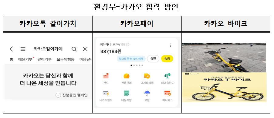 환경부와 카카오는 카카오 플랫폼을 활용한 대국민 탄소중립 생활실천 운동(캠페인) 추진, 카카오 직원·건물의 탄소중립 실천 확산을 위한 ‘탄소중립 포인트제’ 참여, 탄소중립 포인트와 카카오페이 연계, 자전거 관련 국민 탄소중립 실천 프로그램 개발 등을 위해 상호 협력할 계획이다.