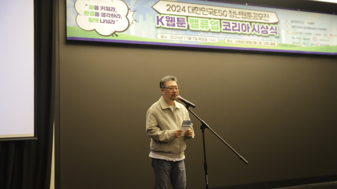 | 7일 오후 2시 서울 상암 스탠포드호텔에서 열린 ‘제1회 2024 대한민국 ESG 청년웹툰 공모전’ 시상식에서 권창호 웹툰협회 사무국장이 시상에 대해 설명하고 있다. |