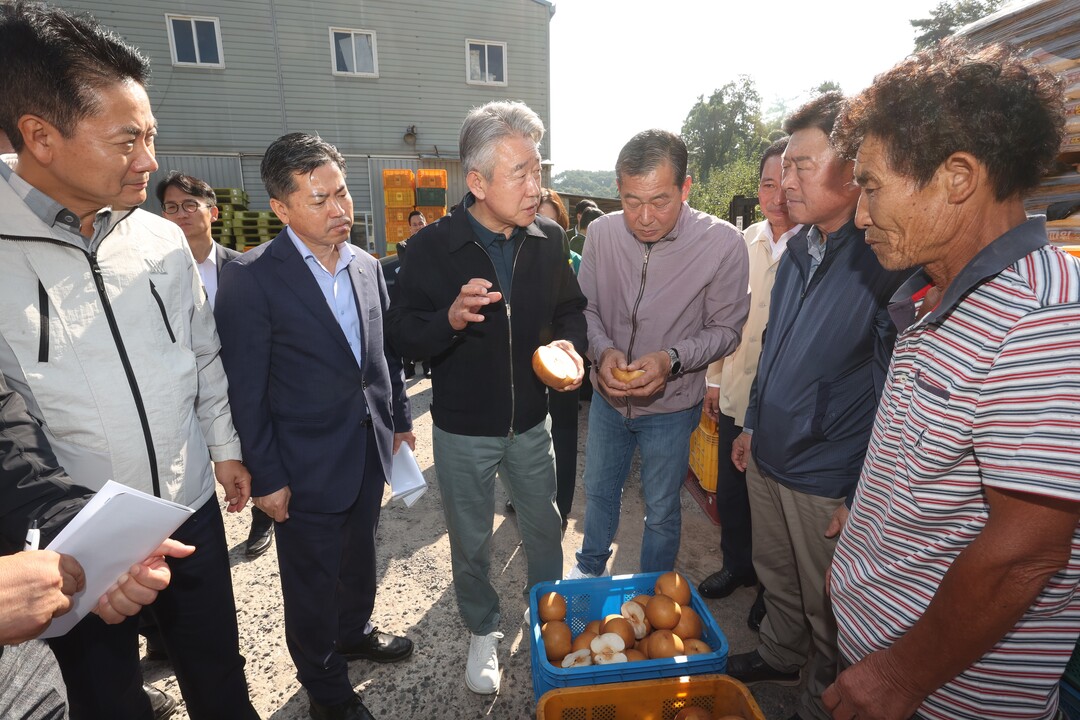 | 강호동 농협중앙회장(왼쪽 3번째)이 배 피해현황을 점검하며 관계자들과 의견을 나누고 있다. [사진=농협중앙회] |