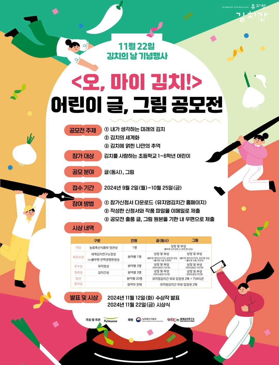 나경인 뮤지엄김치간 팀장은 “미래세대와 함께 김치의 계승과 발전을 이어나가고자 지난해에 이어 올해도 공모전을 준비했다”며 “앞으로도 뮤지엄김치간이 한국의 김치와 김장문화를 어린이뿐 아니라 성인과 외국인에게까지 알리는 대표 공간이 될 수 있도록 노력하겠다”라고 말했다.