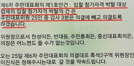 게다가 흑석2구역 주민대표회의 위원장은 앞서 SNS를 통해 조합원들에게 “제6차 주민대표회의 제1호 안건 ‘입찰 참가자격 박탈 대상 업체의 입찰 참가자격 박탈의 건’은 주민대표위원 25인 중 감사 3분은 의결에 빼고 의결토록 하겠다”고 통보한 바 있다.