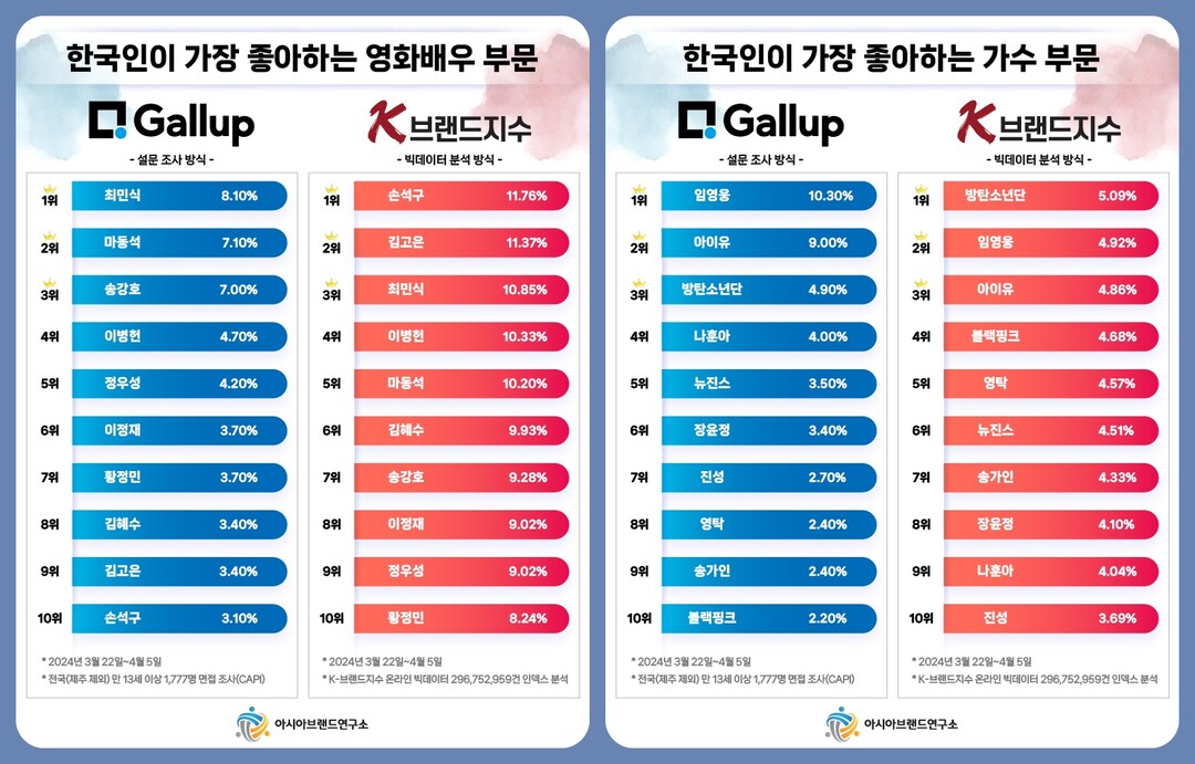[하비엔뉴스 = 박정수 기자] 최근 아시아브랜드연구소와 한국갤럽이 대중문화 6개 부문에 대한 설문 조사를 실시한 가운데, 양 사의 순위 차이에 대해 누리꾼 사이에서 ‘갑론을박’이 이어지고 있다.