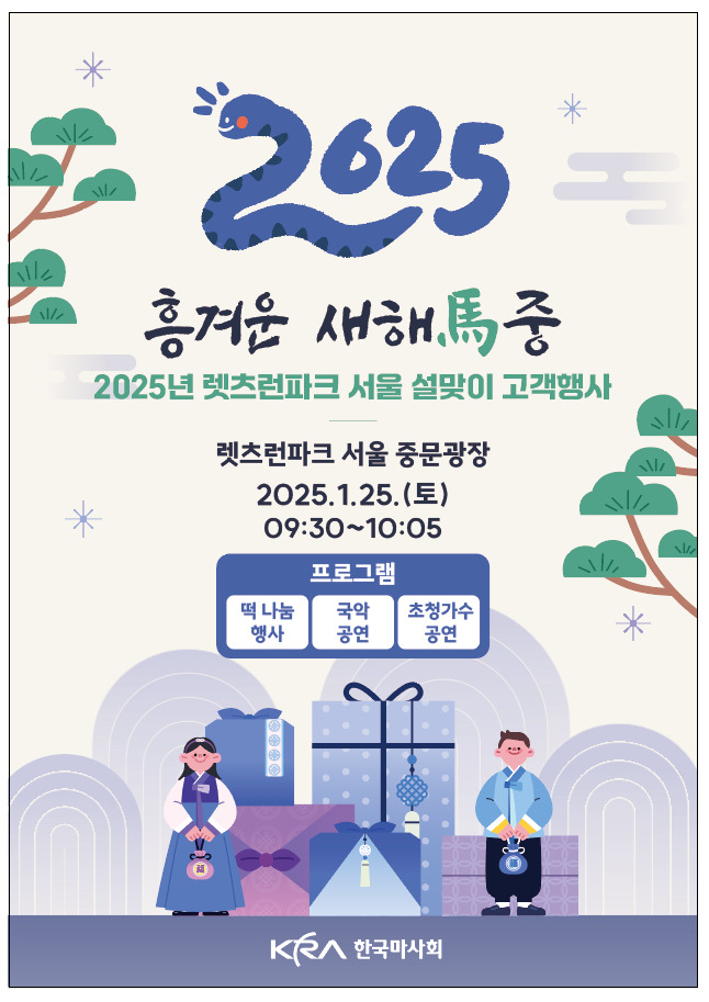 [하비엔뉴스 = 윤대헌 기자] 한국마사회는 오는 25일 렛츠런파크 서울 중문 광장에서 설 맞이 ‘흥겨운 새해馬중’을 개최한다고 23일 밝혔다.