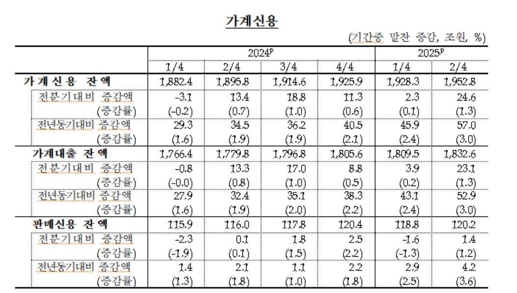 한국은행이 19일 발표한 '2025년 2분기 가계신용(잠정)' 통계를 보면 지난 6월 말 기준 가계신용 잔액은 1952조8천억원으로 집계됐다.
