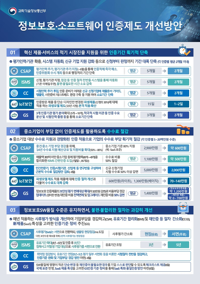 이에 과기부는 지난달 강도현 제2차관 주재 SaaS 기업 간담회를 비롯한 정보보호·SW산업계 협·단체 및 주요 수요기업, 제도별 인증·평가기관 등과 다수의 설명회 및 간담회에서 의견을 수렴해 인증 기간과 인증 비용, 절차를 개선하기로 했다.
