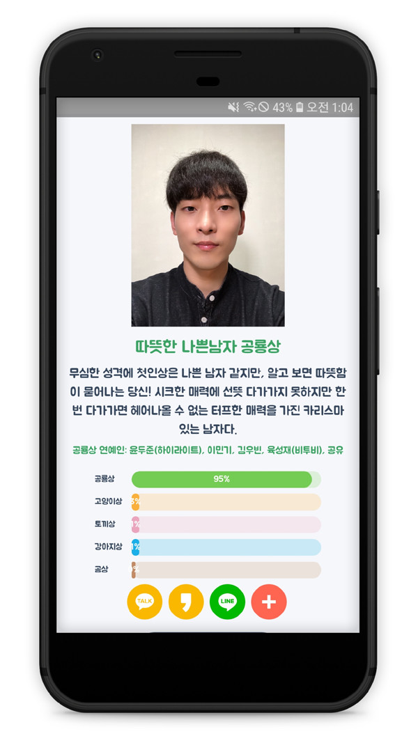 인공지능이 판단한 동물상 테스트의 결과는 토끼상, 여우상, 사슴상 등의 동물을 얼마나 닮았는지 그 정도가 백분율로 표시되며 그에 따른 대표 동물상 연예인 목록과 성격 특징에 대한 분석도 포함되어 있다.