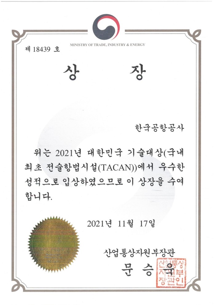[하비엔=문기환 기자] 한국공항공사는 17일, ‘2021 대한민국 기술대상 시상식’에서 국내 최초로 개발해 상용화에 성공한 전술항법장비(TACAN)의 기술력을 인정받아 산업통상자원부 장관상을 수상했다.
