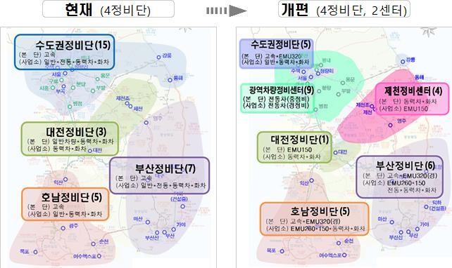 중앙선, 충북선 등 EMU-150 정비를 위한 거점으로서 전기기관차·화물열차 중정비를 담당하는 중부권 정비센터를 충북 제천에 신설해 정비 효율성을 높일 계획이다. 이에 따라 차량정비 조직은 현재 4정비단에서 ‘4정비단 2센터’로 개편된다.