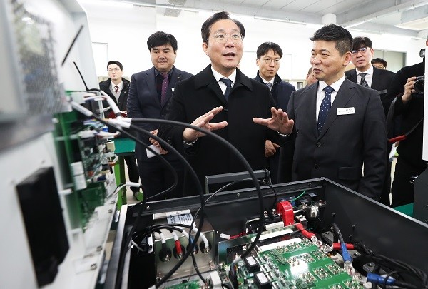 ▲ 성윤모 산업통상자원부 장관이 지난 13일 오전 수소경제 활성화 로드맵 발표 1년을 맞아 경기도 용인시 소재의 신재생에너지 시스템 제조 중소기업인 ㈜지필로스를 방문해 시설을 살펴보고 있다.(사진=과학기술정보통신부)