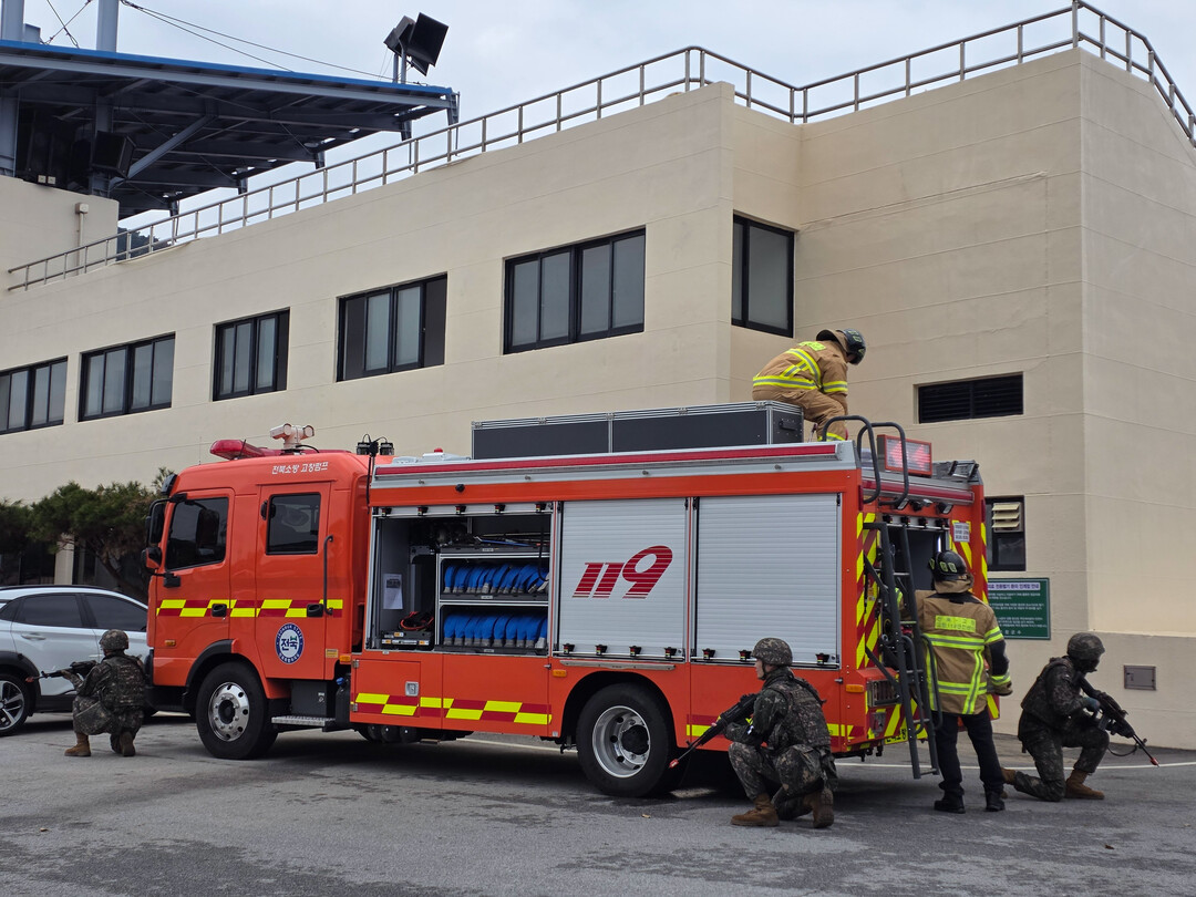 한편, 폭발로 운동장 일부 시설이 붕괴되면서 화재가 발생하자 군ㆍ경ㆍ소방 합동상황실에서는 신속하게 소방차를 출동시키고, 추가 붕괴에 대비하여 화재 진압과 함께 부상자 구조를 완벽히 수행함으로써 훈련은 성공적으로 종료됐다.