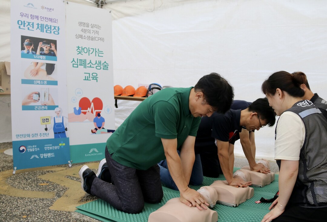이번 VR안전체험에서는 오토바이사고 등 생활 속 다양한 위기상황을 가상현실을 통해 체험하고 그에 따른 대처방법을 홍보했다. 또 심폐소생술교육에서는 강원랜드 안전실 소속 전문 간호사들이 인체모형을 활용해 흉부 압박자세와 압박부위, 강도 등을 교육하는 시간을 가졌다.