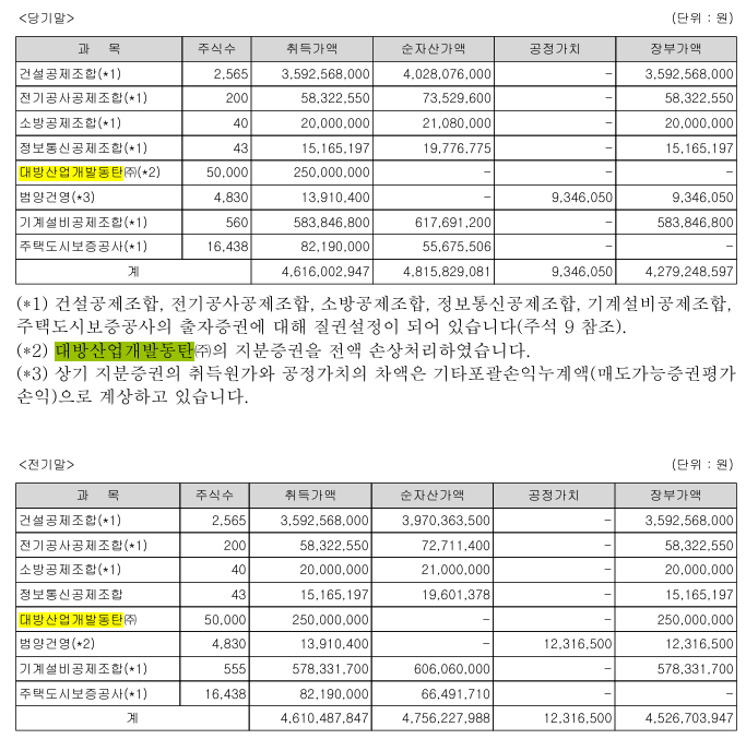 이와 함께 대방건설이 해당 계열사의 지분가치를 회계상 전액 손상처리한 점도 확인된다. 지난 3일 공시된 감사보고서에 따르면 대방건설은 대방산업개발동탄의 지분증권(취득가액 2억5000만 원)을 전액 손상처리해 장부가액을 ‘0원’으로 반영했다. 업계에서는 이를 보수적인 회계 판단에 따른 가치 하락 반영으로 해석하는 시각도 있다.