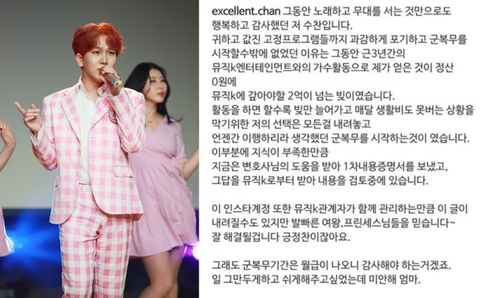 한편 지난 24일 김수찬은 현재 소속사와의 분쟁 사실을 공개하면서 3년간 정산을 받지 못했다고 주장했다. 그는 "귀하고 값진 고정 프로그램들까지 과감하게 포기하고 군 복무를 시작할 수밖에 없었던 이유는 근 3년간의 뮤직K엔터테인먼트와의 가수 활동으로 제가 얻은 것이 정산 0원에 뮤직K에 갚아야 할 2억이 넘는 빚이었기 때문"이라고 폭로했다.