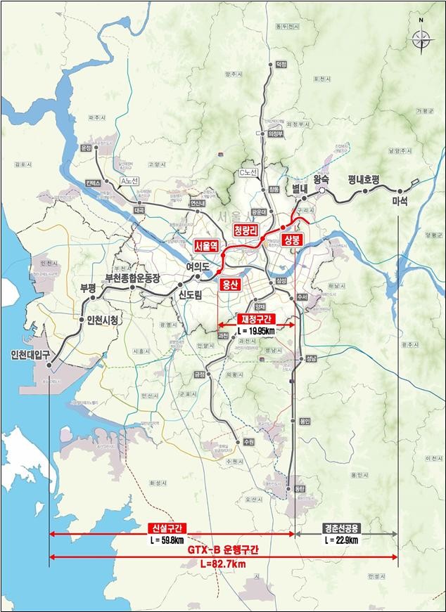 GTX-B노선(인천대입구~마석) 중 용산~상봉구간은 재정사업으로, 인천대입구~용산, 상봉~마석 구간은 민자사업으로 추진한다.