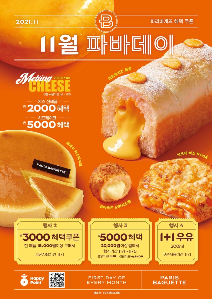 ‘파바데이’는 매월 1일 매장에서 제품 구매 시 총 구매액이 1만5000원 이상이면 3000원 할인 혜택을 제공하는 행사다. 또 매월 새롭게 선보이는 신제품 혜택 쿠폰도 제공한다. 11월에는 치즈 페어와 연계해 1~5일 1만원 이상 구매 시 사용 가능한 치즈 브레드 신제품 2000원 할인 혜택 쿠폰과 클래식 치즈케이크 5000원 할인 혜택 쿠폰을 제공한다.