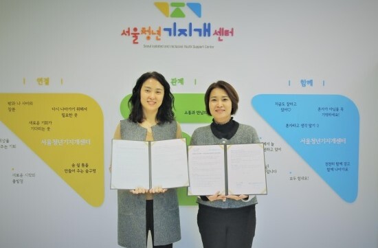 | 정은정 서울금융복지상담센터장(왼쪽)과 김주희 서울청년기지개센터장이 업무협약 후 기념촬영을 하고 있다. [사진=서울시] |
