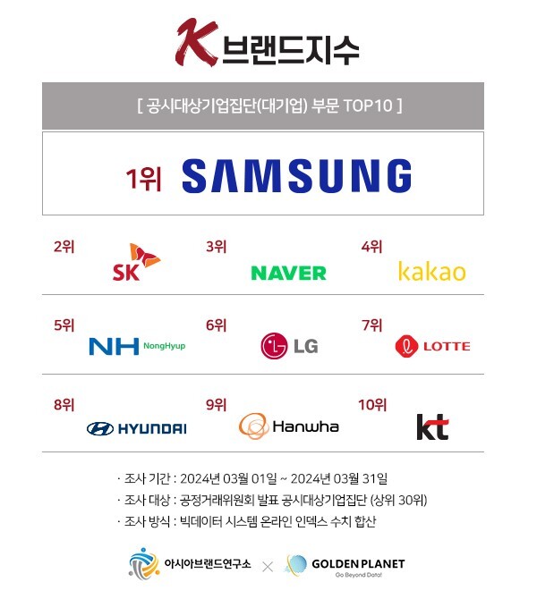 아시아브랜드연구소와 골든플래닛이 자체 개발한 빅데이터 시스템을 통해 산출된 대기업 부문은 지난 3월1~31일 온라인 빅데이터를 기반으로 분석됐다.