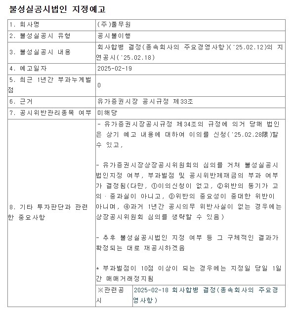 풀무원은 앞서 지난 2009년 춘천공장과 제이두부공장, 제일생면공장, 스프라우트 등 생산 자회사를 무증자 흡수합병한다고 공시했다가 1개월 후 합병을 취소하며 불성실공시법인으로 지정된 바 있다. 당시 풀무원은 벌점 2점을 부과받았다.