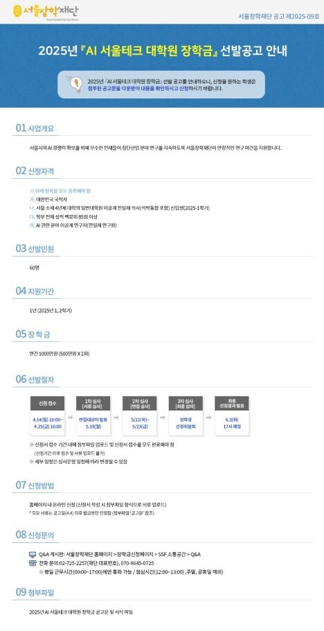 | 서울장학재단의 ‘AI 서울테크 대학원 장학금’ 선발 공고 포스터. [사진=서울시] |