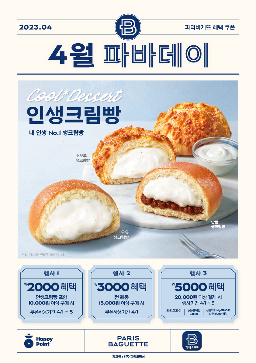 파리바게뜨는 특히 부드러운 우유 생크림을 풍성하게 채운 ‘인생크림빵’을 이달의 프로모션 제품으로 선정해 4월1~5일 ‘인생크림빵’ 포함 1만원 이상 구매 시 2000원 상당의 혜택을, 2만원 이상 구매 시 5000원 상당의 혜택을 제공한다.