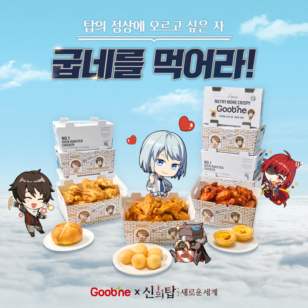 3종 세트는 굽네 공식 홈페이지에서 1만개 한정 수량으로 판매되고, 구매고객에게는 ‘신의 탑: 새로운 세계’ 스페셜 쿠폰이 증정된다. 또 굽네치킨을 주문하면 ‘신의 탑: 새로운 세계’ 전용 박스에 삽입된 QR코드를 통해 게임 아이템을 100% 받을 수 있다.