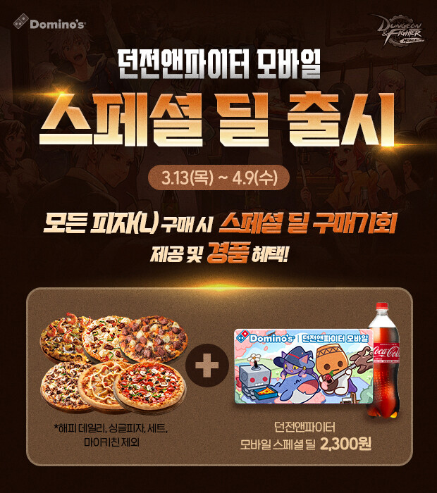 이번 프로모션은 도미노피자 자사 채널(홈페이지, 모바일웹, 자사앱)을 통해 모든 피자(L) 구매 시 던전앤파이터 모바일 게임에서 사용할 수 있는 쿠폰과 코카-콜라 1.25ℓ를 2300원에 구매할 수 있다. 쿠폰에는 도미노피자 오라 아바타와 골드 등 다양한 아이템이 들어있다.